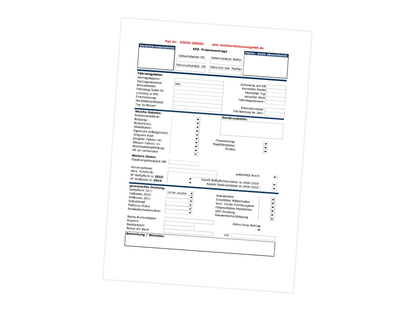 Es muss nicht immer ein pdf oder word-Dokument sein, welche Sie an Ihre Kunden versenden. Nutzen Sie unsere speziell für Versicherungsmakler vorgefertigten Onlineformulare und binden Sie diese auf Ihrer Homepage ein.